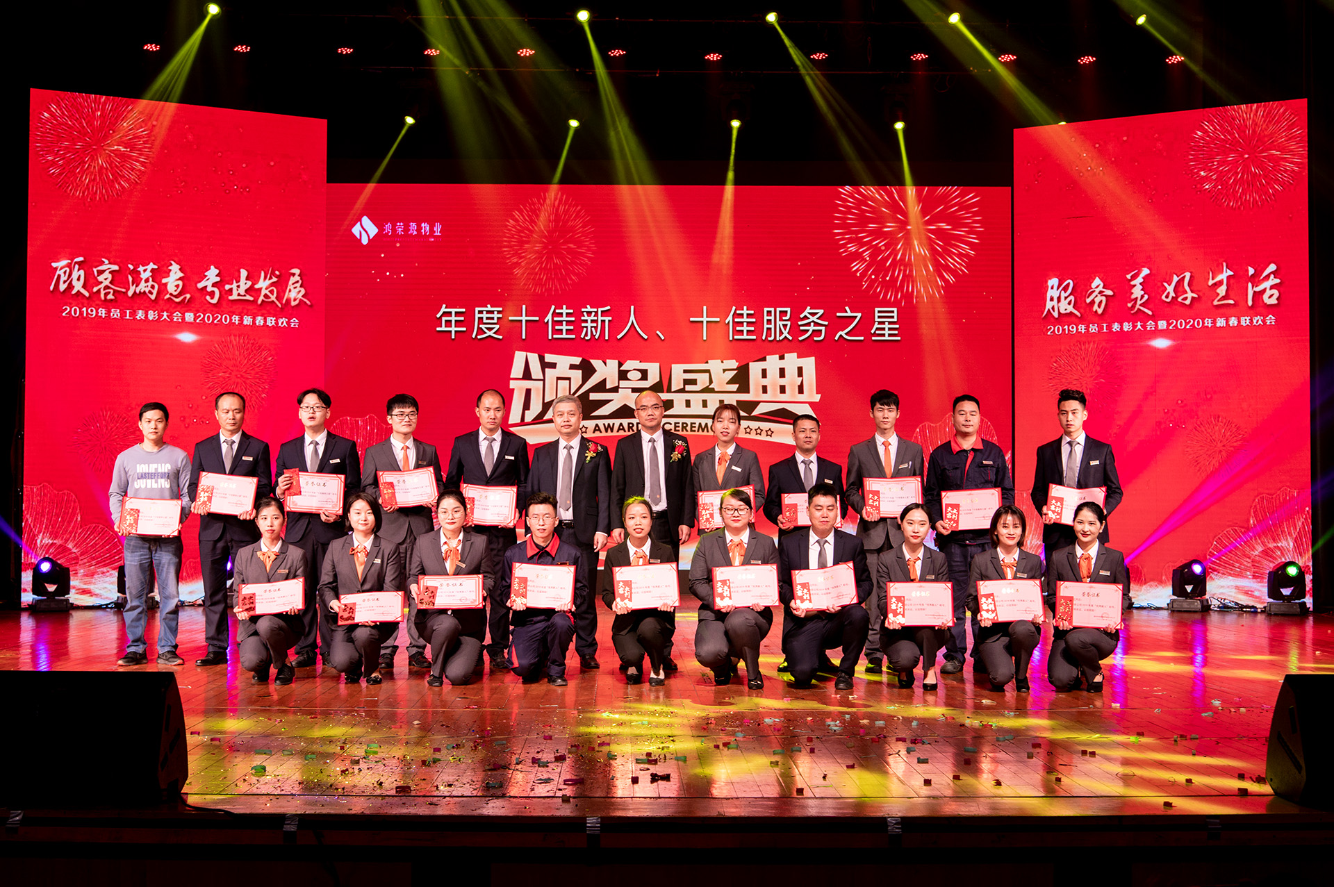 总结会后,我们迎来了以“致远美好未来”为主题的2019员工表彰大会暨2020年新春联欢会。 过去的一年,在鸿荣源物业涌现出一大批优秀团队和个人,他们在各自的岗位上用实际行动彰显个人能力、创造价值。公司特邀鸿荣源集团执行董事兼物业公司董事长姚如忠先生、鸿荣源集团高级副总裁郑燕华女士、鸿荣源集团客服中心总经理杨海英女士莅临表彰盛典,与我们共享这荣誉时刻。 集团副总裁兼物业公司总经理吴耀平先生进行开场发言,他表示:一年辛勤拼搏,凝结丰硕成果,每一份成绩都离不开团体员工的努力拼搏,向所有辛勤付出的鸿荣源物业人尤其是此时此刻还在工作岗位的员工,表示诚挚的谢意。2019公司创新员工关怀与激励机制,建立了“鸿荣之星”与“鸿荣之将”培训体系及人才梯队,推出爱心积分、互助基金与合伙人机制,客户满意度明显提升,员工离职率也大幅降低。未来,希望大家严格履职,自省自强,共同营造积极向上、协同共进的企业氛围。寄语全体员工:在新的战略方向下,我们要用心服务业主,巩固客户关系,提升专业能力,取得更大的成长与收获。